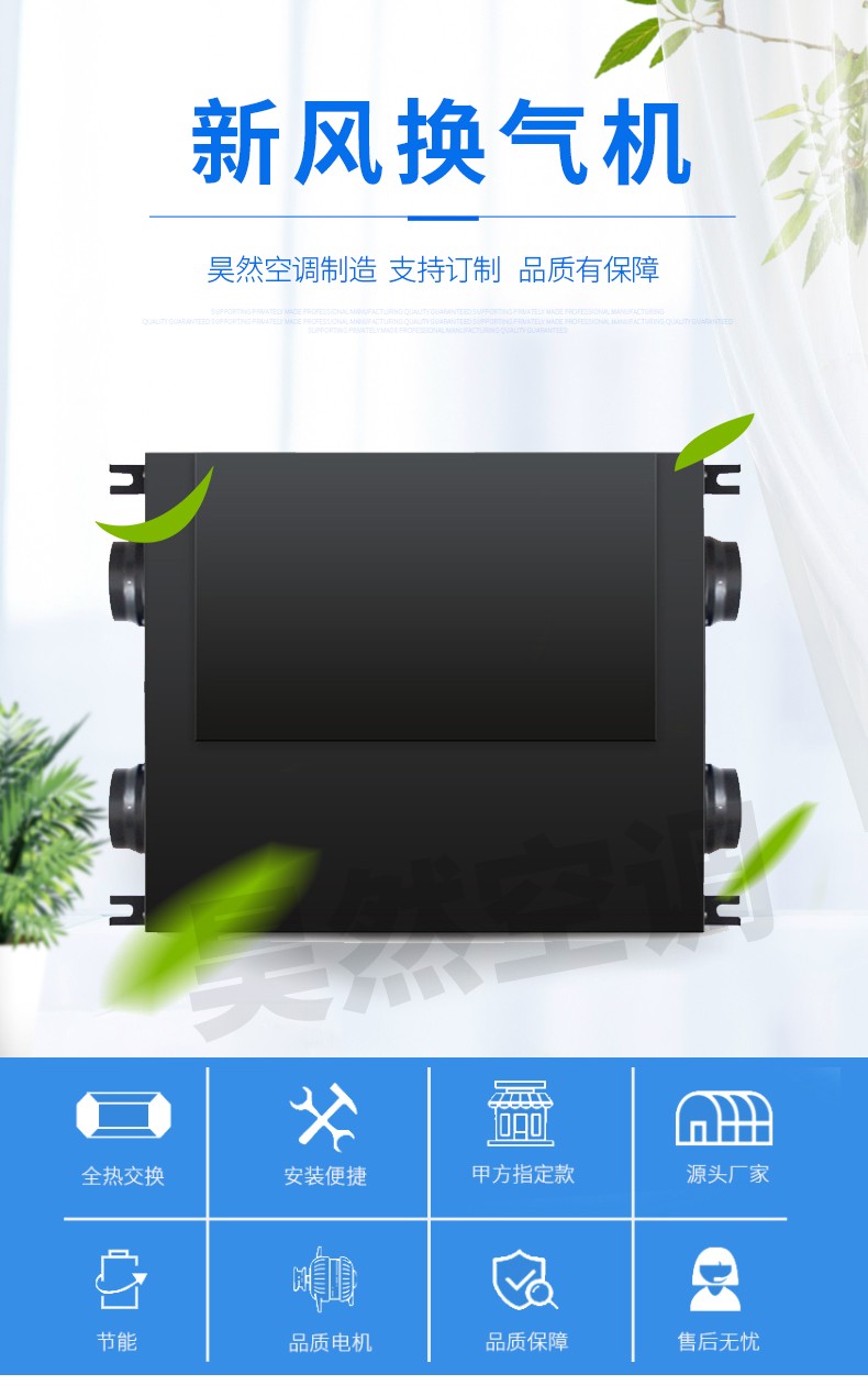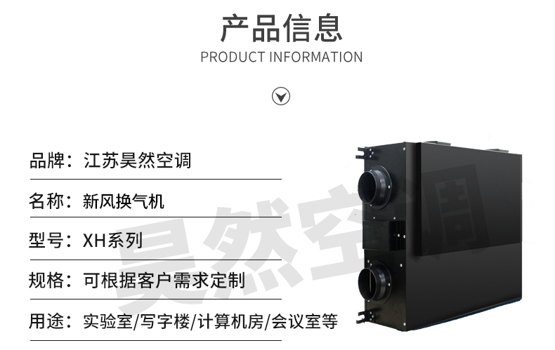 • 江苏昊然空调设备制造有限公司——新风换气机是根据在密闭的室内一侧送风另一侧引风,则在室内会形成“新风流动场”的原理进行设计研制的。它依靠机械送风、引风,强迫在系统内形成新风流动场。是一种时刻保持室内空气洁净清新的新型环保电器。这种独立的室内空气置换、净化循环系统,能在排除室内的污染空气的同时,输入自然新鲜空气,将输入室内的新风先经过滤、杀菌、加热、增氧等多项处理。