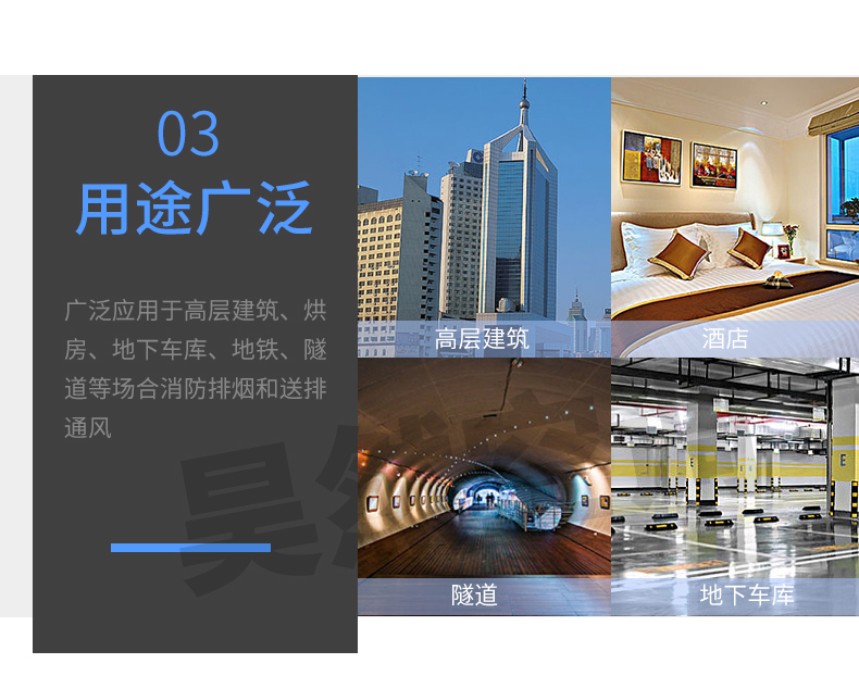 HTF轴流式消防排烟风机设计独特,高温电机全封闭内置,配设专门的电机冷却系统,采用CAD软件多目标优化设计的轴流和混流叶轮结构,通过多速驱动形式,达到一机两用(即常用送排通风和消防使用时高温排烟),配设电控箱后可远程自动控制。具有耐高温性能优良、效率高、体积小,安装简便(水平、垂直、吊装均可)等优点,广泛应用于高层建筑、烘房、地下车库、地铁、隧道等场合消防排烟和送排通风。