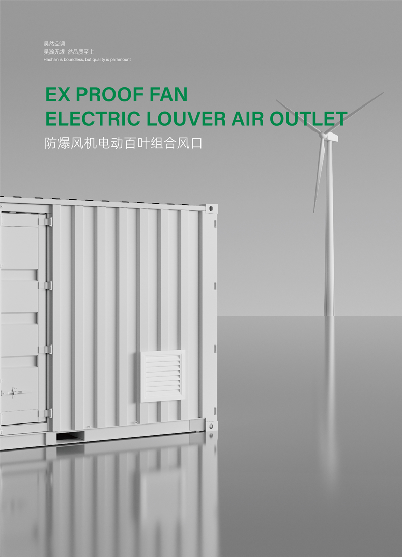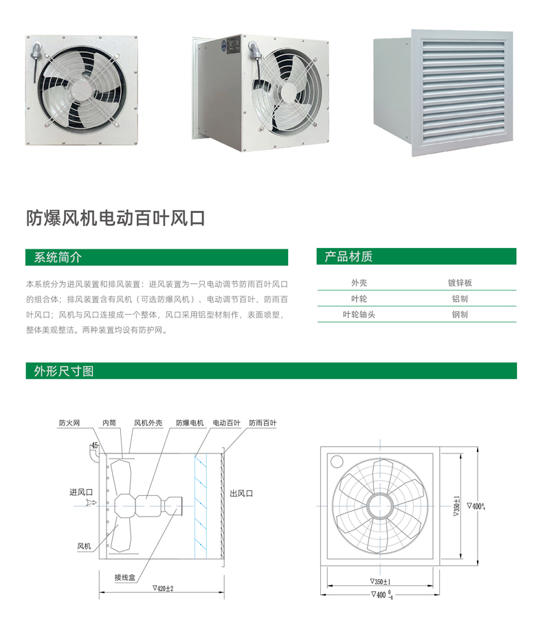 本系统分为进风装置和排风装置:进风装置为一只电动调节防雨百叶风口的组合体;排风装置含有风机(可选防爆风机)、电动调节百叶、防雨百叶风口;风机与风口连接成一个整体,风口采用铝型材制作,表面喷塑,整体美观整洁。两种装置均设有防护网。
